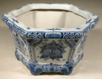 - Original Royal Delft Herstellungsjahr 1978 Auf sechs eingerollten Standfüßen reliefierter, sechskantiger Korpus, durch Halbsäulen gegliedert. Umgeschlagener, breiter Rand. Blütendekor in unterglasurblauer Malerei. Durchm. 27cm.