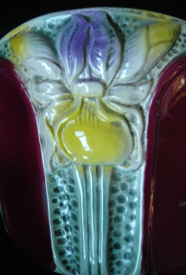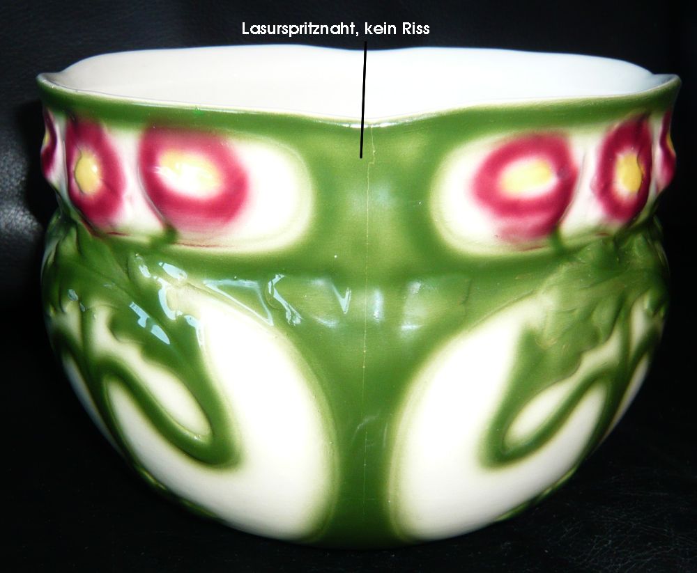 < Schöner alter orig. Jugendstil-Cachepot Leider 3 kl. Chips und ein winziger Riss am Rande, nicht störend ! Höhe 18 und Durchm. ca 16 cm. Manufaktur bedingte Unregelmäßigkeiten in der Glassur Mit dem alten Reliefstempel der zwischen 1880 und 1900 verwendet wurde.
