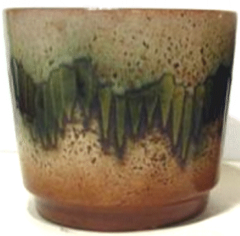 Laufglasur: beige ocker bis orange auf rotem Scherben. Bauchiger Korpus mit großer Öffnung (ca. 10,5 cm)
