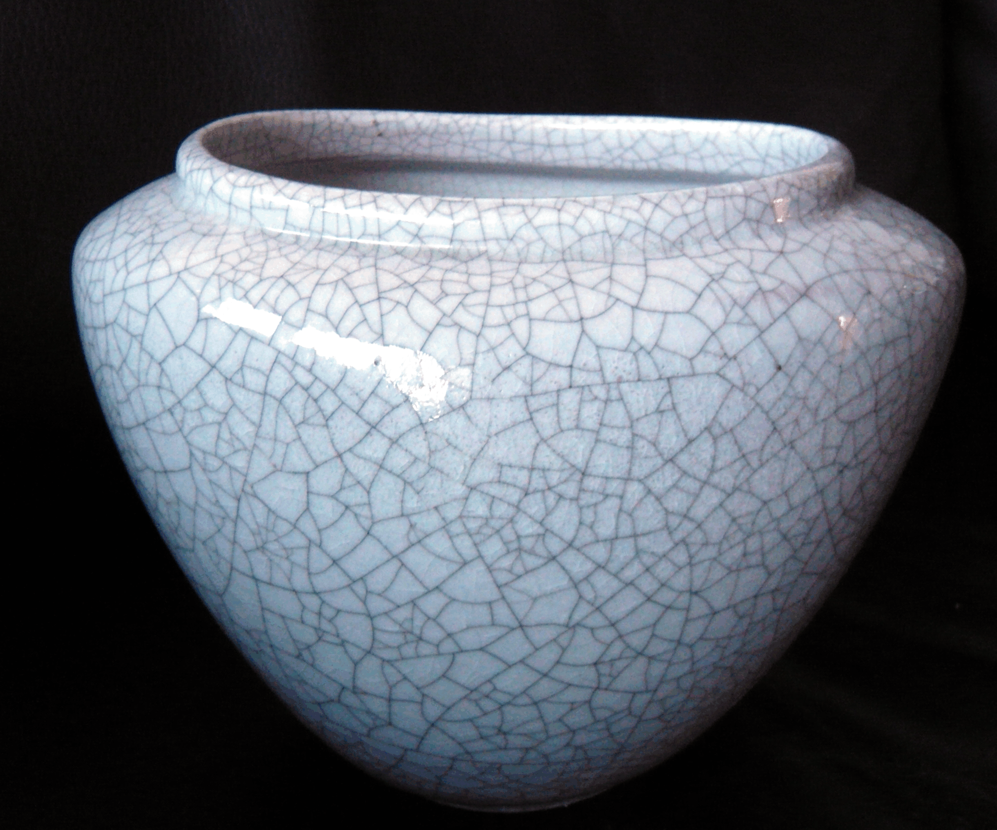 heller Scherben, matte Glasur Kugeliger Korpus mit Drehspuren. Ausgestellter Hals. Türkisfarbene Schlickerglasur. Originales Klebeetikett.